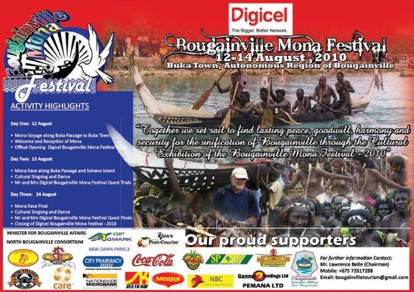 The 2010 Mona Festival FESTIVAL SUCCESS By Aloysius Laukai (16.08.2010) The second Bougainville Mona Festival 2010 was hailed a success. The three- day show attracted more than TEN THOUSAND people throughout the festival. The Mona Festival which is a cultural show featuring the locally built traditional Bougainville canoe called “MONA”. The show also attracted overseas tourists and local tourists from PNG. The show opened with a local send off ceremony by the chiefs of Malasang village and the four Monas then travelled all the way to Buka Town where the festival was opened by Bougainville’s President JOHN MOMIS. The four Monas had to rest at Ieta village for Water from the Ieta chiefs then continued to KOKOPAU to a large waiting Warriors and cultural groups and chiefs from Selau and Suir. PNG’s comedian was in one of the canoes which made extra attraction to the crowd. The 2010 DIGICEL BOUGAINVILLE MONA FESTIVAL was sponsored by DIGICEL PNG, LAE BISCUIT COMPANY and several other companies. In his speech PRESIDENT MOMIS encouraged the people of Bougainville to preserve their custom as this was our own identity. He praised the organizers of the festival for making the festival a reality. MR. MOMIS also gave TEN THOUSAND KINA as the ABG’s contribution towards the festival. One of the other highlight was the 2010 MR AND MISS DIGICEL BOUGAINVILLE MONA FESTIVAL. The winners were the Mister and Miss Malasang. They are GEORGE MACKANZIE AND LORENA RICHIE. Representative of the main Sponsor DIGICEL, Bougainville Manager, HENRY ONSA Junior said that Miss Digicel Mona Festival 2010 would be sponsored for the PNG Miss PNG quest next year. Meanwhile the Chairman of the National Cultural Council, DR. JACOB SIMET called on the Mona Festival committee to put the festival on the yearly calendar of the PNG Cultural shows so that tourists can know when the Mona Festival is held. He said that the calendar should be within the New Guinea Island shows so that Tourists can tour Provinces to Provinces following these festivals and enjoy what PNG has to over with Tourism. The Festival was closed by the ABG Vice President, PATRICK NISIRA who promised to allocate TWO HUNDRED THOUSAND for the festival next year.